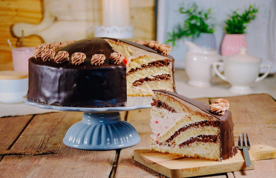 eine besondere Schichttorte aus Schoko-, Vanille- und Erdbeerbuttercreme zwischen lockeren Biskuitböden überzogen mit kakaohaltiger Fettglasur