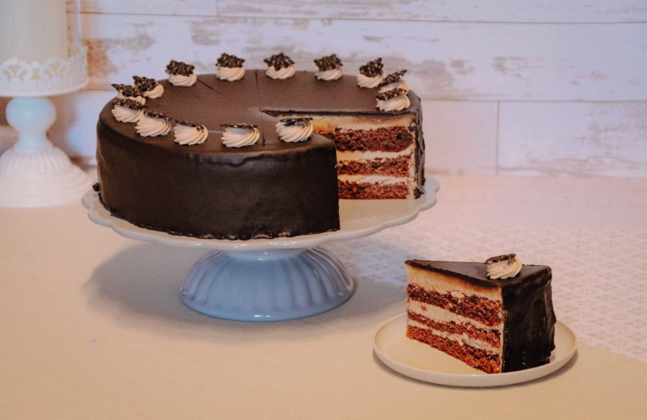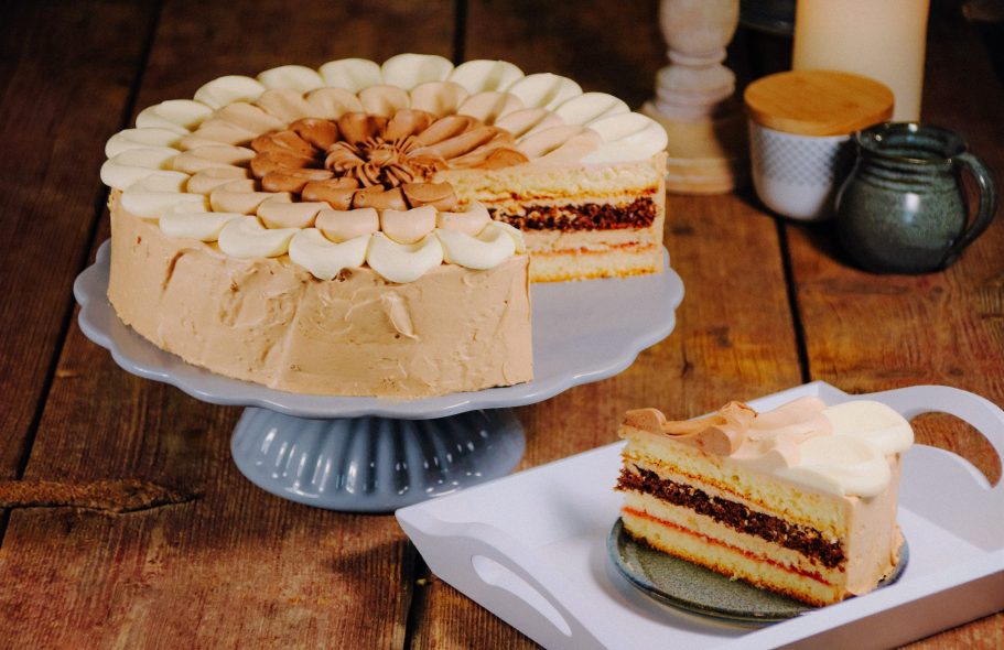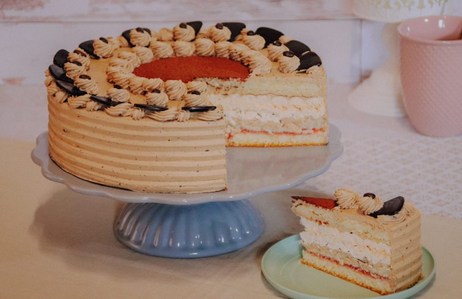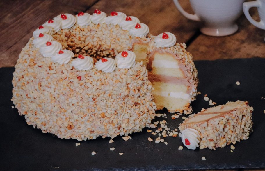 eine klassische Spezialität aus lockeren Biskuitböden mit Schoko- und Vanillecreme, ummantelt von gerösteten Erdnüssen