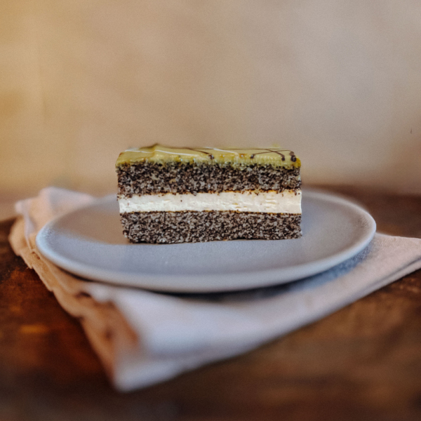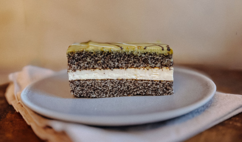 Leckerer Mohn-Rührteig mit einer Pistazien-Cremefüllung und einer zart schmelzenden Pistaziendecke.
