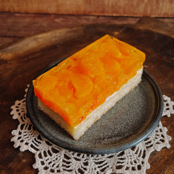 Ein fluffiger Biskuitboden mit Creme bestichen und reichlich mit Mandarinen belegt sowie einem Guss aus Gelantine.