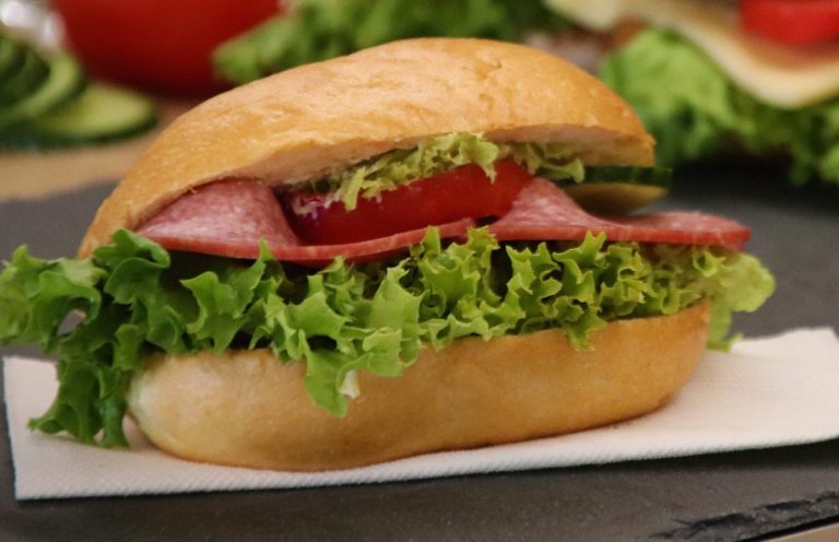 Unsere Knüppel belegt mit Salami, Tomaten, Gurken und frischem Salat.