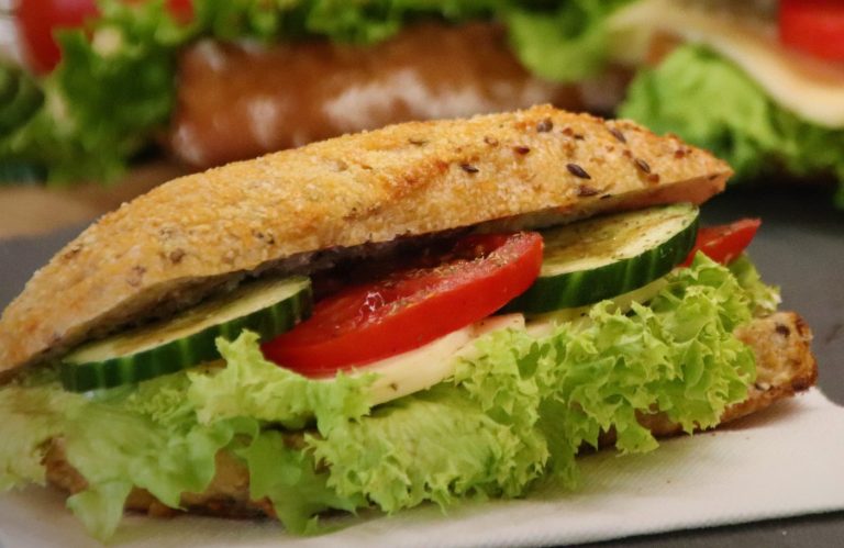 Unsere leckeren Körnerstangen belegt mit saftigem Schinken und Käse, Tomaten, Gurken und Salat.