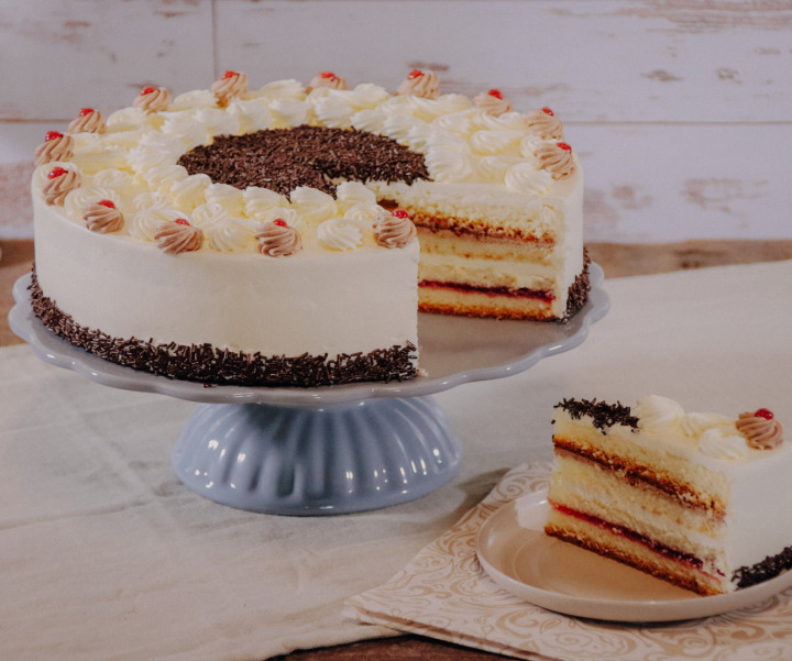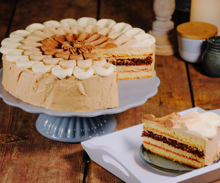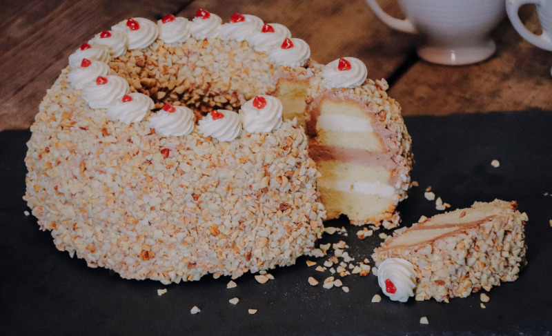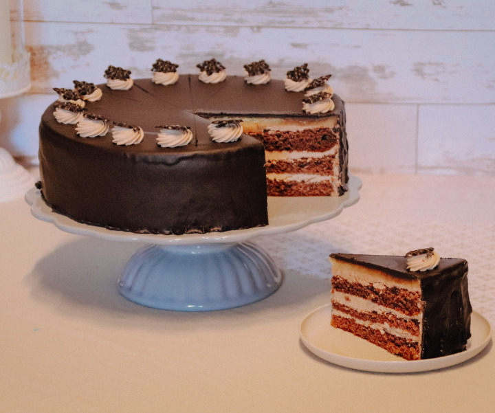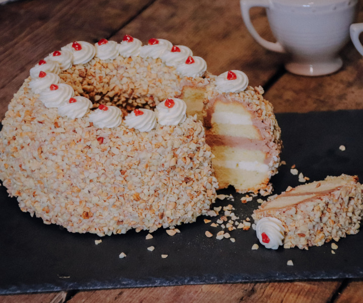 eine klassische Spezialität aus lockeren Biskuitböden mit Schoko- und Vanillecreme, ummantelt von gerösteten Erdnüssen