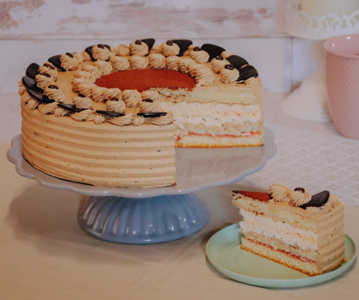 Verführerische Mocca-Buttercreme mit einer dünnen Schicht Marmelade wird gebettet zwischen lockeren Biskuitböden. Unser Schleizer Baiser gibt dieser Torte einen unverwechselbaren Geschmack.