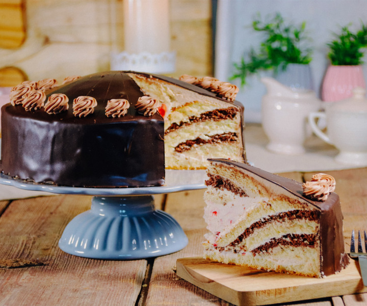 Schoko-, Vanille- und Erdbeerbuttercreme zwischen lockeren Biskuitböden überzogen mit kakaohaltiger Fettglasur
