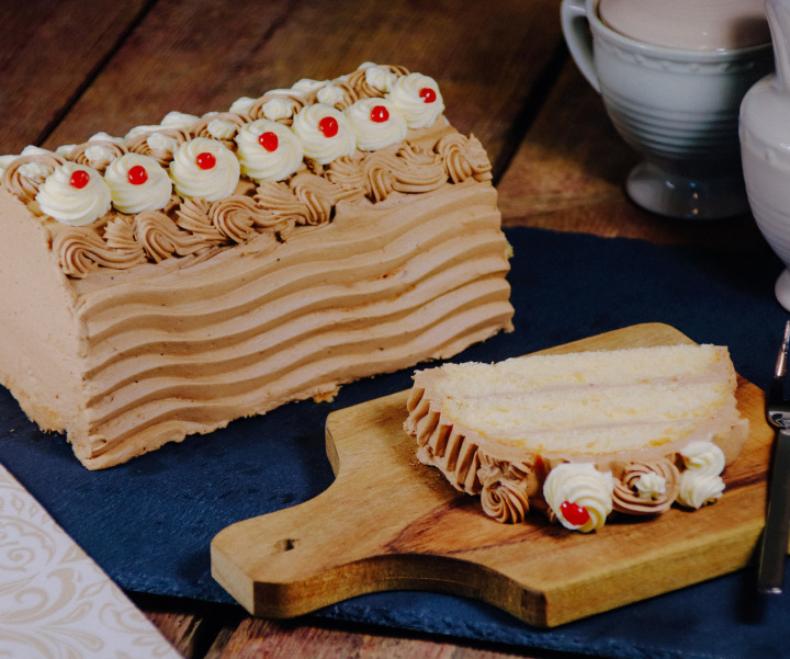 Vanille- und Schokobuttercreme mit einer feinen Schicht Marmelade zwischen lockeren Biskuitböden